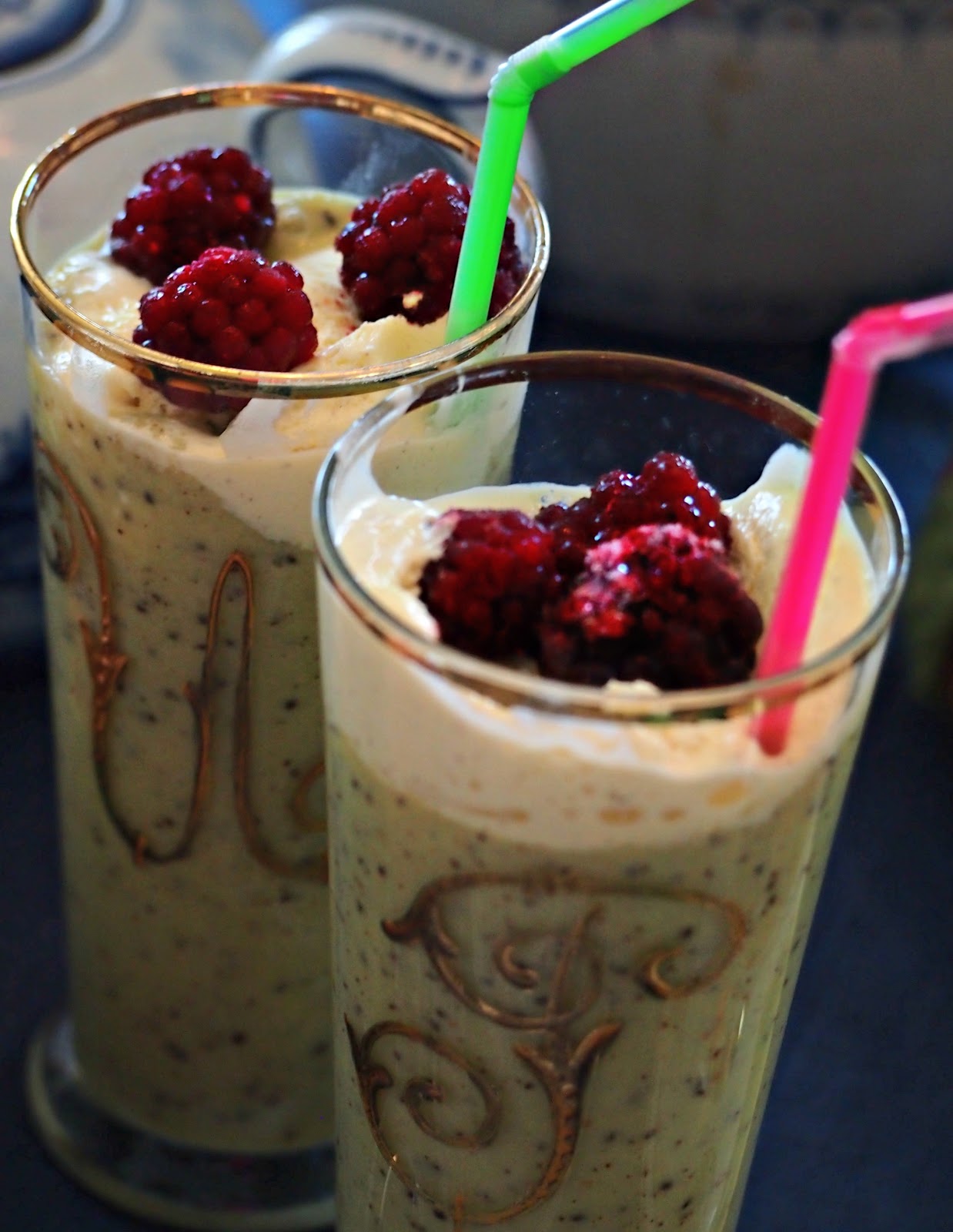 Las but not least the kiwi-raspberry-shake. What you need is 10 kiwis, 2 handfuls of raspberries, about 100 ml. of milk, and 4 to 6 scoops of vanilla ice cream. Trying to be as quick as possible mix all ingredients together, pour in a glass and serve with fresh or frozen raspberries.